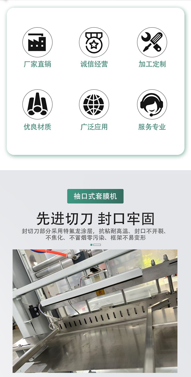 產品經輸送帶進入設備后,薄膜被自動套在產品外部,通過電熱絲高溫封切形成袖口狀包裝,隨后進入熱收縮通道,利用高溫使薄膜均勻收縮,緊貼產品表面,完成 “套膜 - 封切 - 熱收縮” 三步包裝流程。