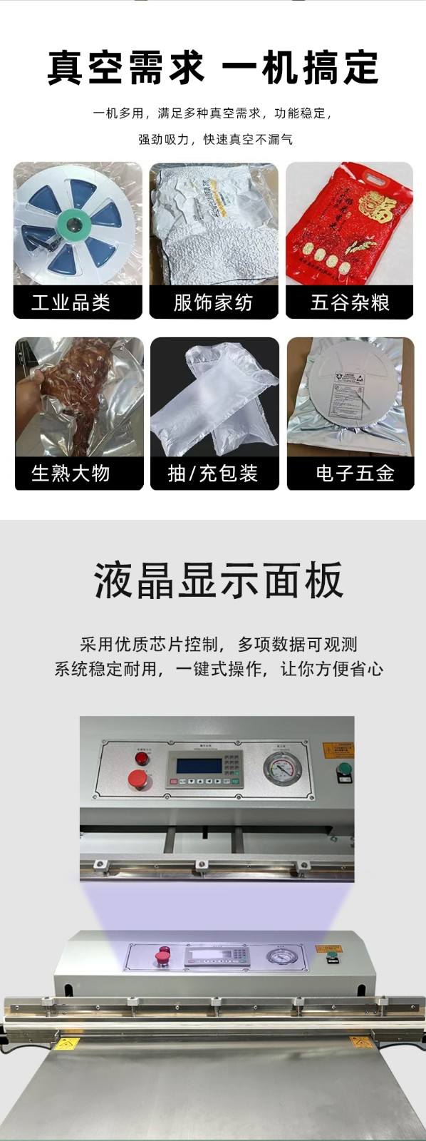 適配范圍無上限:無需考慮真空室大小,無論是 1 米長的地毯、整床棉被,還是帶凸起的工具、異形機械零件,只要真空袋能容納物品、袋口能對接抽氣嘴,就能完成包裝。